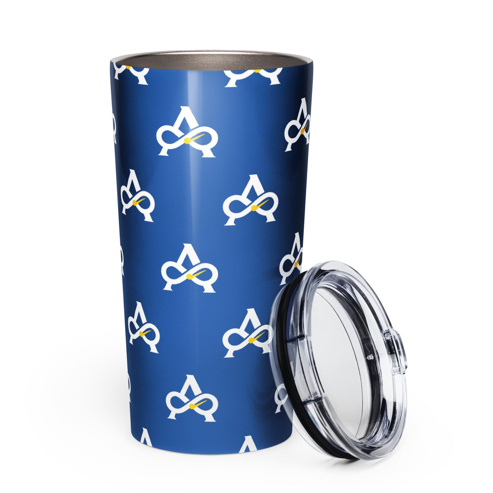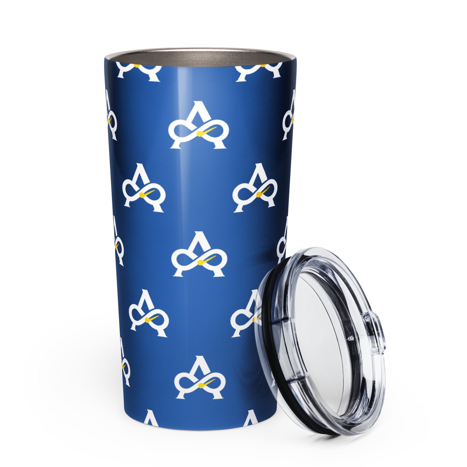 Allatyme: Infinity A – Tapered stainless steel tumbler – Royal, White & Yellow